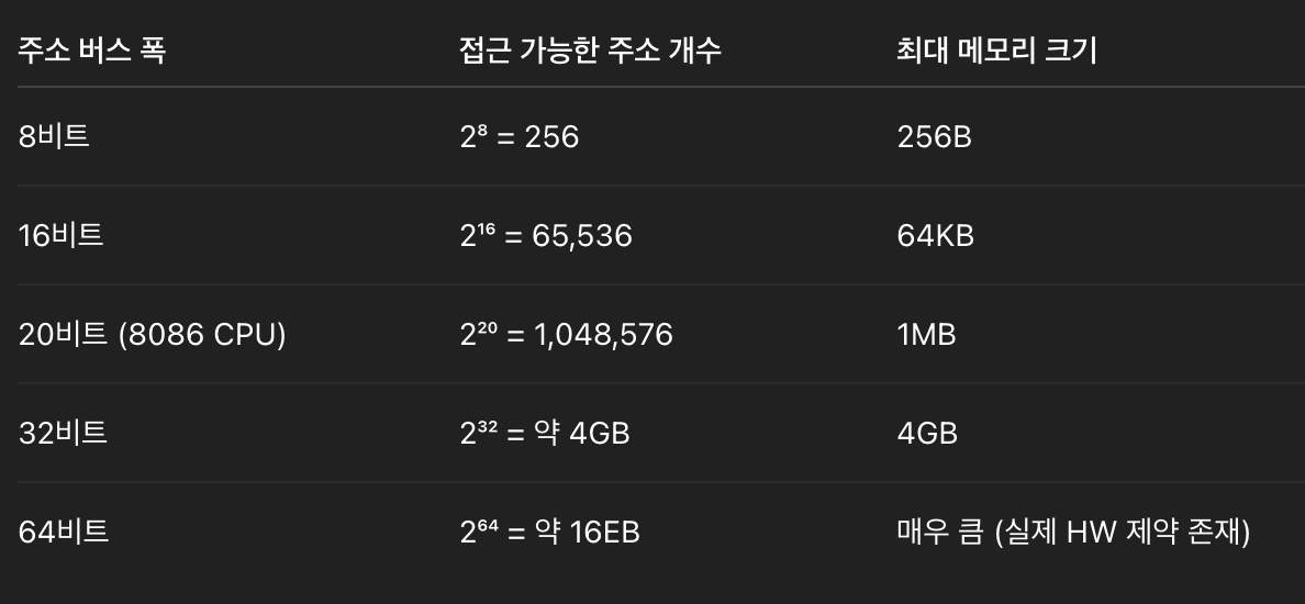: 주소 버스의 비트 수가 클수록 CPU가 접근할 수 있는 메모리 주소 공간이 커진다.