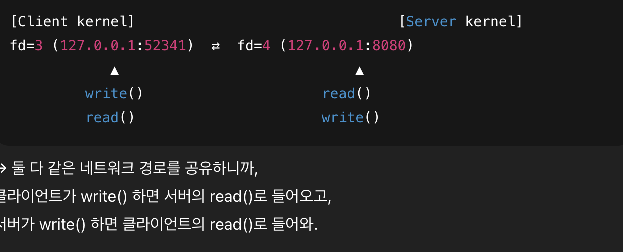 둘이 커널 레벨에서 TCP로 연결된 한쌍의 통로 됨
