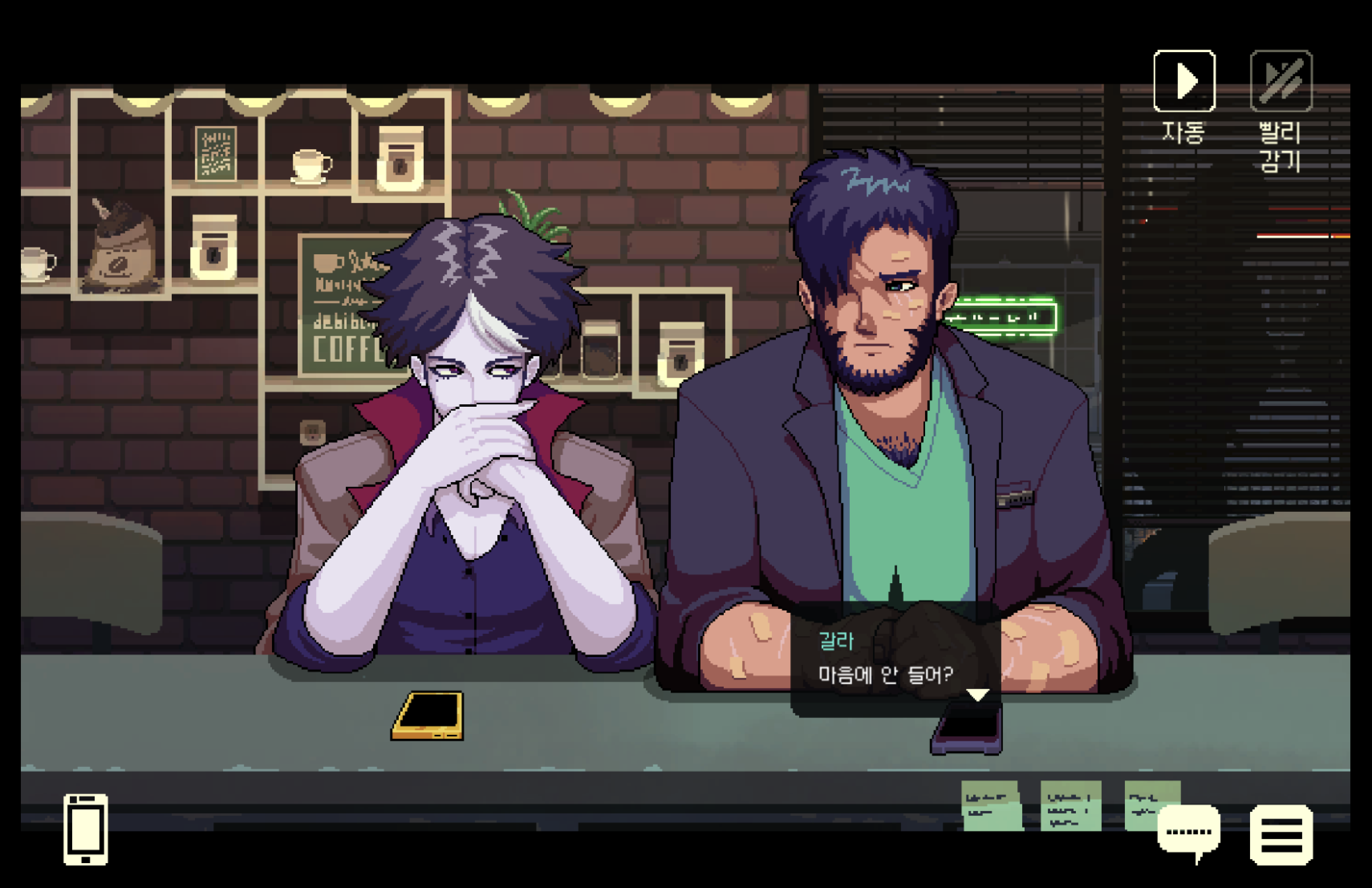 - 대화 진행 방식: [캐릭터] 모션(표정, 눈 깜빡임, 어깨 들썩임) , [배경] 빗방울+행인 , [음료] 김 효과