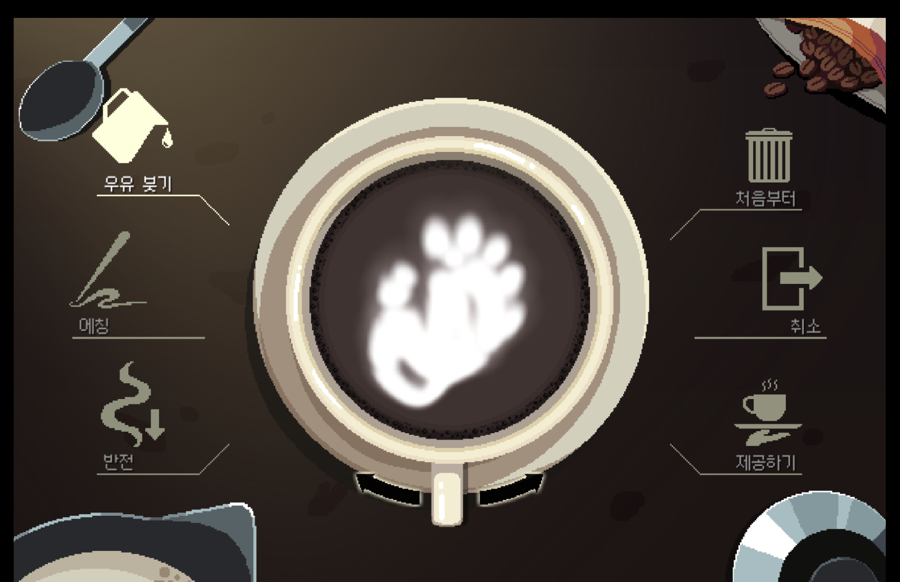 - 라떼 아트 미니게임 : 우유 베이스 음료는 직접 라떼 아트 가능. (스토리에 아트가 영향은 없음)