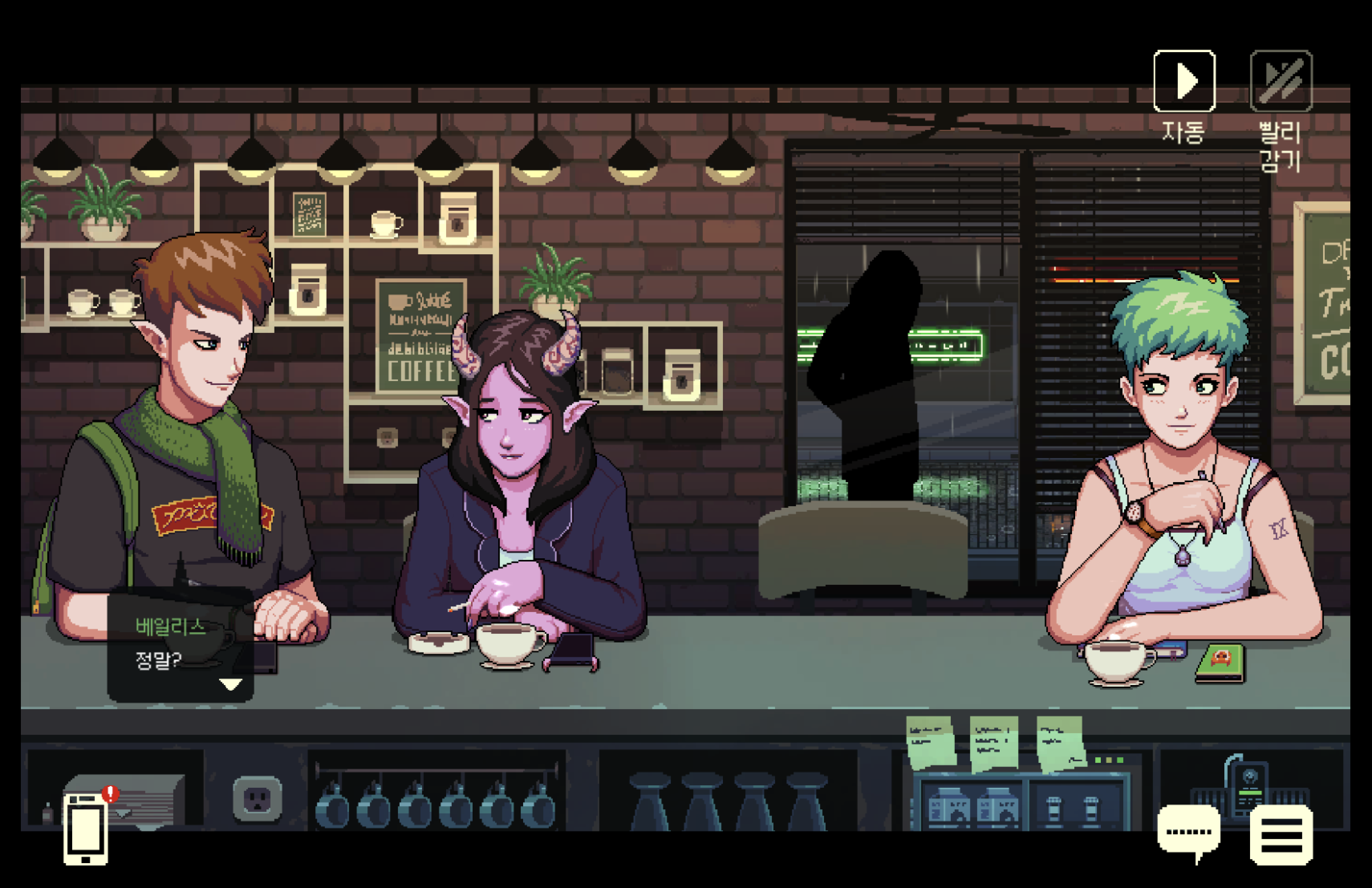 - 대화 선택지가 아닌 "손님에게 어떤 음료 제공하냐"로 분기 결정됨. (1편은 스토리분기는 크게 없고 2편에서 엔딩분기 큼)